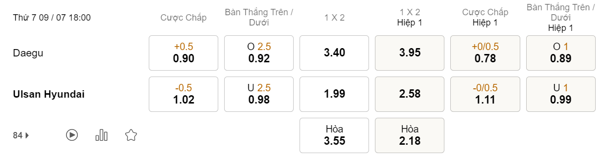 Tỉ lệ kèo Daegu vs Ulsan