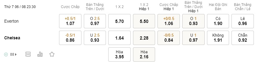 Tỉ lệ kèo Everton vs Chelsea