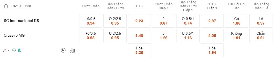 Tỉ lệ kèo Internacional vs Cruzeiro