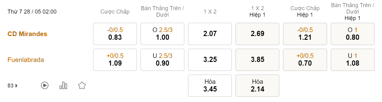 Tỉ lệ kèo Mirandes vs Fuenlabrada