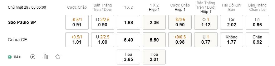 Tỉ lệ kèo Sao Paulo vs Ceara