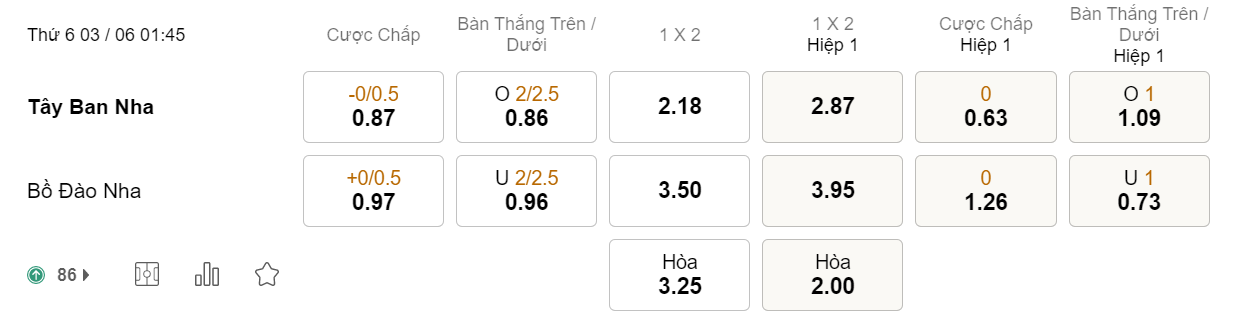 Soi kèo tài xỉu Tây Ban Nha vs Bồ Đào Nha: 0.86*2/2.5*0.96
